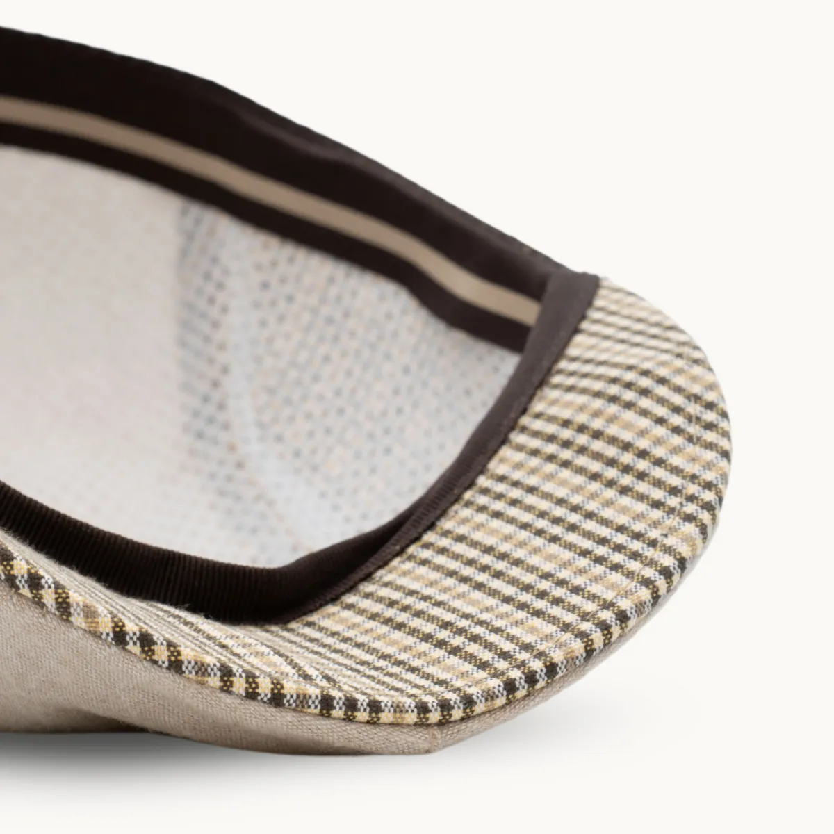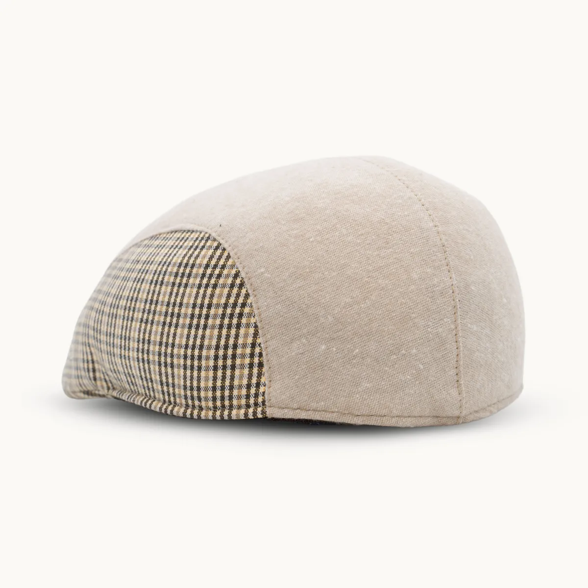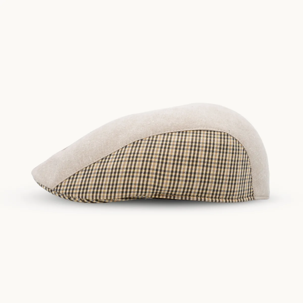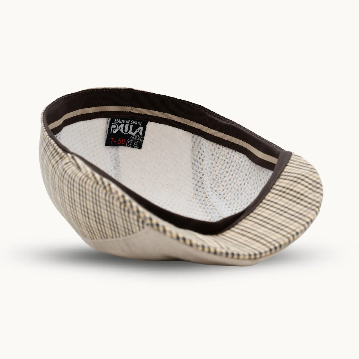 Inspirada en la gorra campera clásica, este modelo combina tela lisa y cuadros beige, logrando un estilo refinado y adaptable a diferentes ocasiones. Su estructura ergonómica se ajusta cómodamente a la cabeza, manteniendo su forma sin perder flexibilidad.