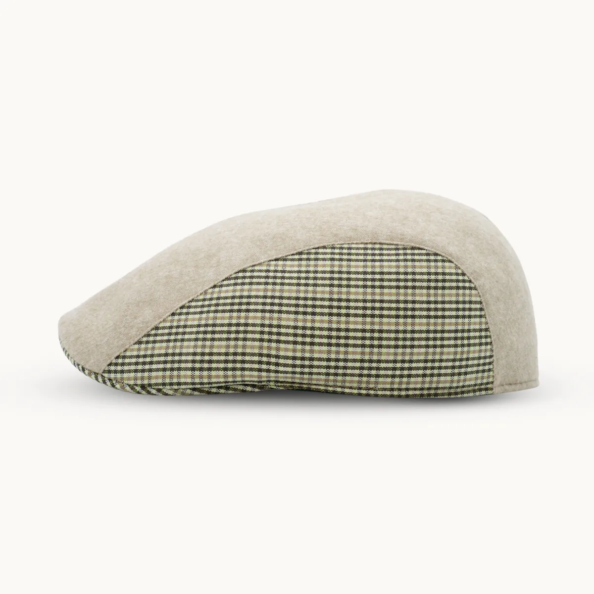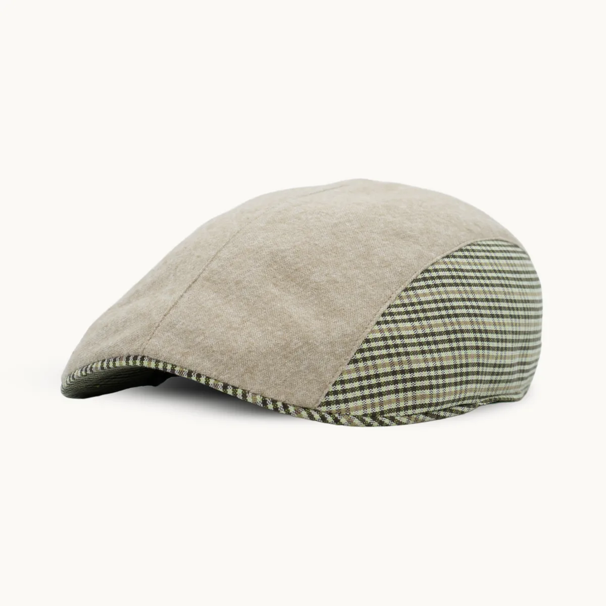El contraste entre la tela lisa beige y el patrón a cuadros verdes en los laterales aporta un toque de sofisticación que hace de esta gorra una pieza versátil. Ideal para looks casuales, pero también perfecta para eventos al aire libre o escapadas a la naturaleza, este diseño clásico encaja con diferentes estilos y ocasiones.